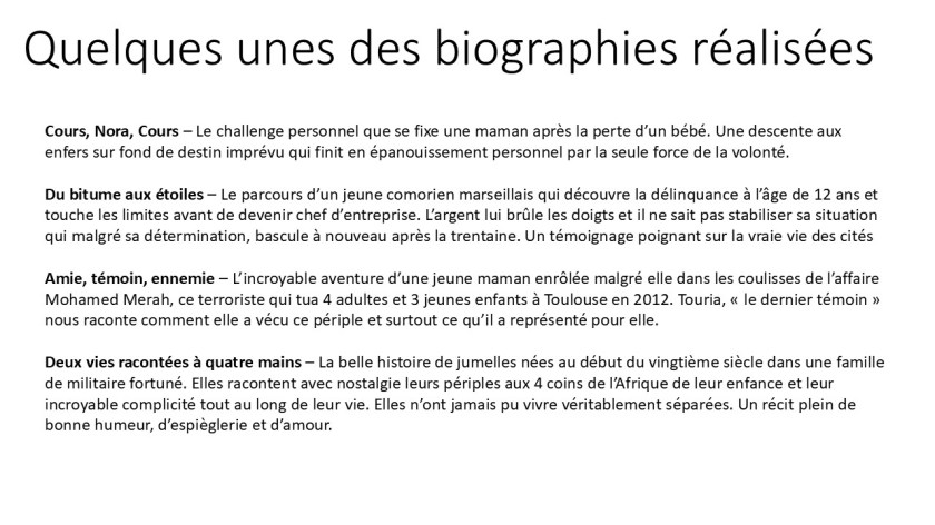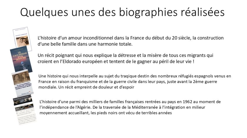 J’écris des biographies depuis plus de 25 ans et je me suis spécialisée dans cette matière qui nécessite une écoute toute particulière des protagonistes, une compréhension particulière de l’âme humaine et aussi une bonne expérience du monde actuel.