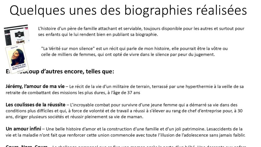 Toutes les biographies se font en fonction des désirs et du budget des clients, sous forme de livre ou de blog, ce dernier étant une solution plus attractive pour les petits-enfants qui auront davantage envie de découvrir la vie de leurs ancêtres sur leur téléphone.
