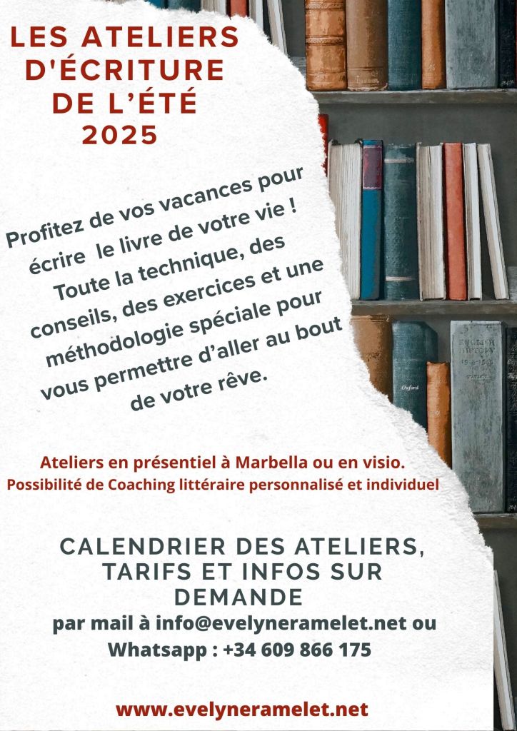 Notre programme d’ateliers d’écriture est prêt pour l’été 2025, en présenciel à Marbella (Espagne) où vous pourrez joindre l’utile à l’agréable, ou en visio si vous n’êtes pas dans la région.